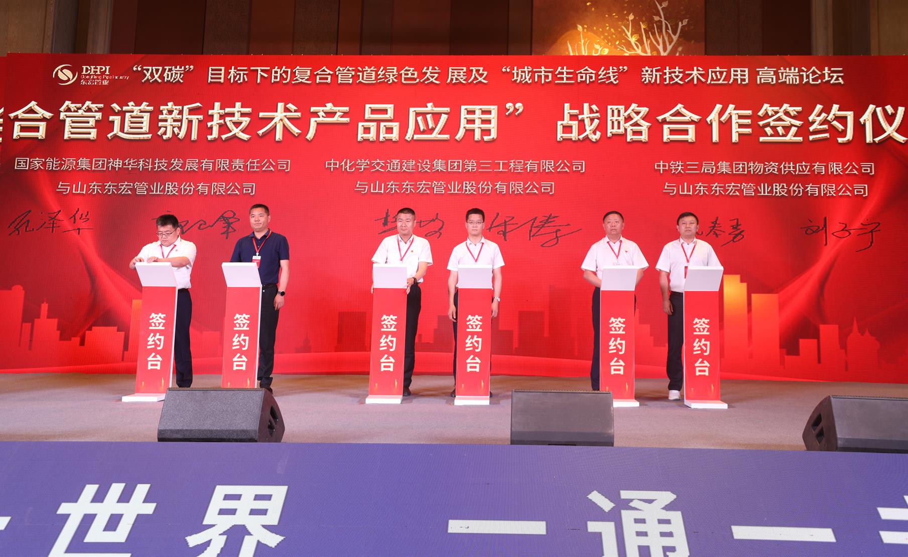 在8位業(yè)內(nèi)領(lǐng)軍專(zhuān)家的精彩分享之后,本次論壇進(jìn)入成果轉(zhuǎn)化環(huán)節(jié),多家領(lǐng)域內(nèi)代表性設(shè)計(jì)院和頭部企業(yè)與東宏股份進(jìn)行了“復(fù)合管道新技術(shù)產(chǎn)品設(shè)計(jì)”戰(zhàn)略合作簽約儀式和“復(fù)合管道新技術(shù)產(chǎn)品應(yīng)用”戰(zhàn)略合作簽約儀式。