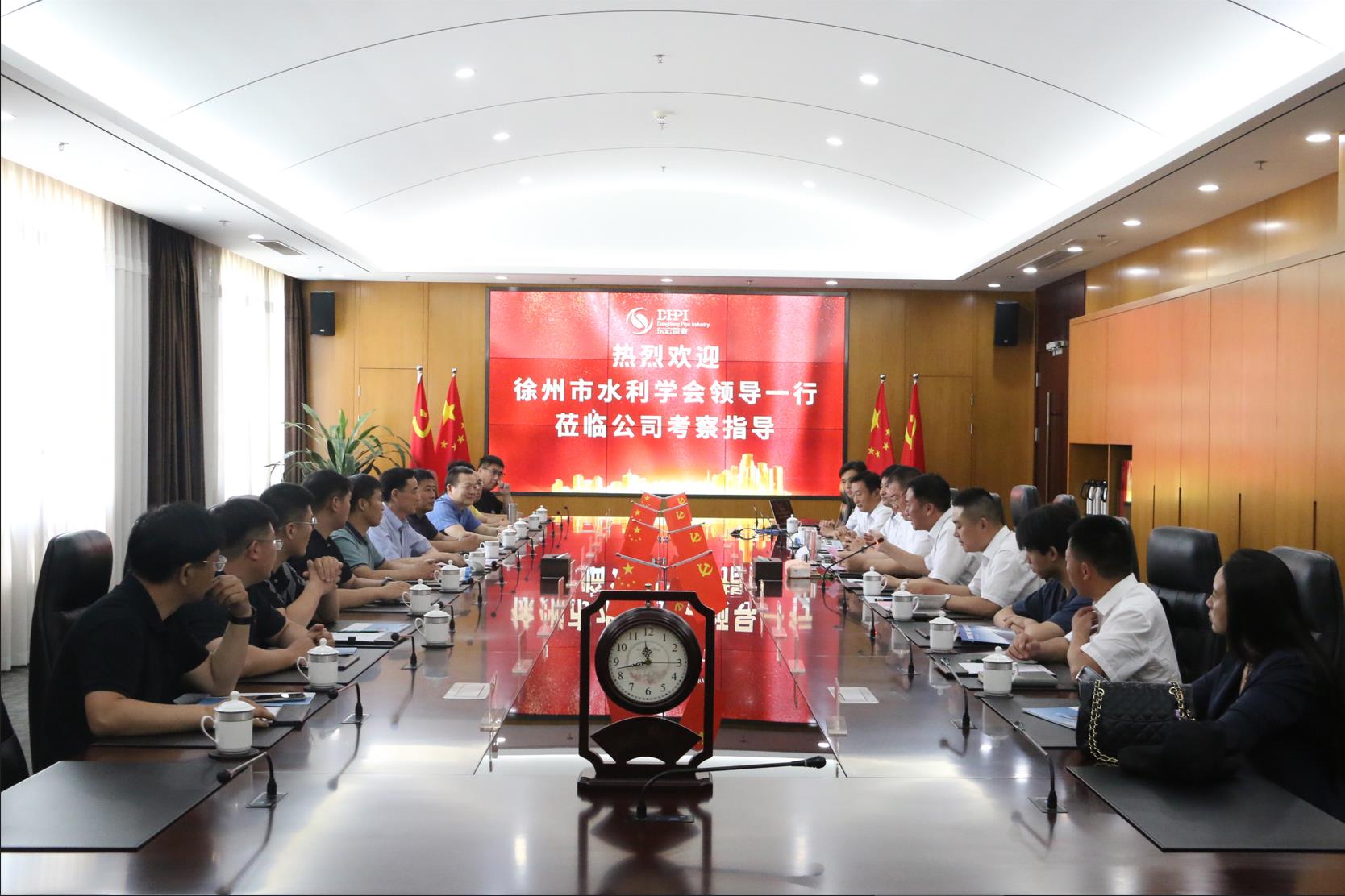座談交流中楊勇理事長表示通過參觀東宏股份感受到三大震撼,對公司科技創新感到震撼、對公司發展運營模式感到震撼、對公司黨建引領企業文化感到震撼,東宏股份提供的高質量管道系統解決方案也完美解決了城市給排水痛點,會有效推動徐州市積水治理、雨污分流、城鄉供水三大攻堅任務實施。